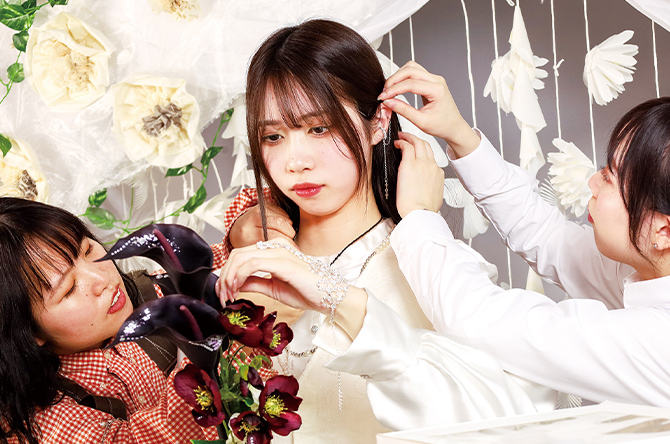 例えば、衣服をデザインすること。例えば、空間を彩るアイテムをデザインすること。例えば、モデルにヘアメイクやスタイリングをすること。それらは全て、本学科で学ぶことができます。ジャンルに捉われない学びの中で、自分の「好き」、「やってみたい」を見つけることができます。ひとりでもグループでも、たくさん見つけた「好き」を組み合わせることで、できる表現があります。